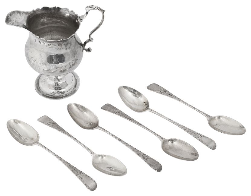 An early George III silver ogee pedestal cream jug and a matched set of George III bright cut teaspoons