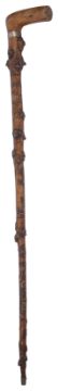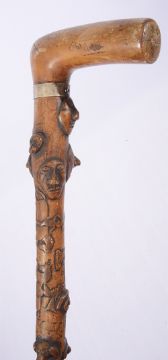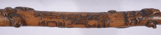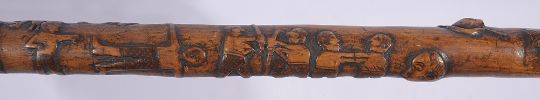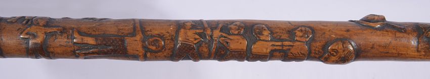 having plain grip handle and white metal collar, the tapering shaft carved in raised relief with various animal and human masks and three bands of continuously carved decoration, the first JU.BIlEE VIR, either side of Christ on the cross, the bust of Queen Victoria in profile and a facing lady and gentleman on horseback, the second a ploughing and sheep herding scene scratch carved with trees, chickens, a peacock and a pig, the third a boxing and wrestling scene in four scenes and and two farmers fighting over a cow being milked by a titled lawyer The LAWSUIT 1887, signed AARON DOSSETT CARVED THIS STICK IN 1887