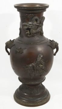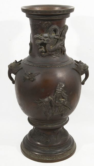 19th century, the body in red brown colour, cast with dragon to neck, the shoulder with dragons head handles, body with the god of longevity Shoulao on a deer and a deity upon a crane