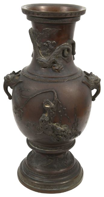 A Chinese patinated bronze two handled baluster vase,