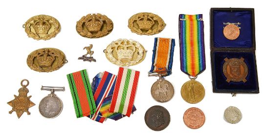 first formed of War and Victory medals, 1914-15 campaign star, on ribbons together with a war medal awarded to 3574 PTE. W. Riddle. R.Scots, various regimental badges etc., (qty)