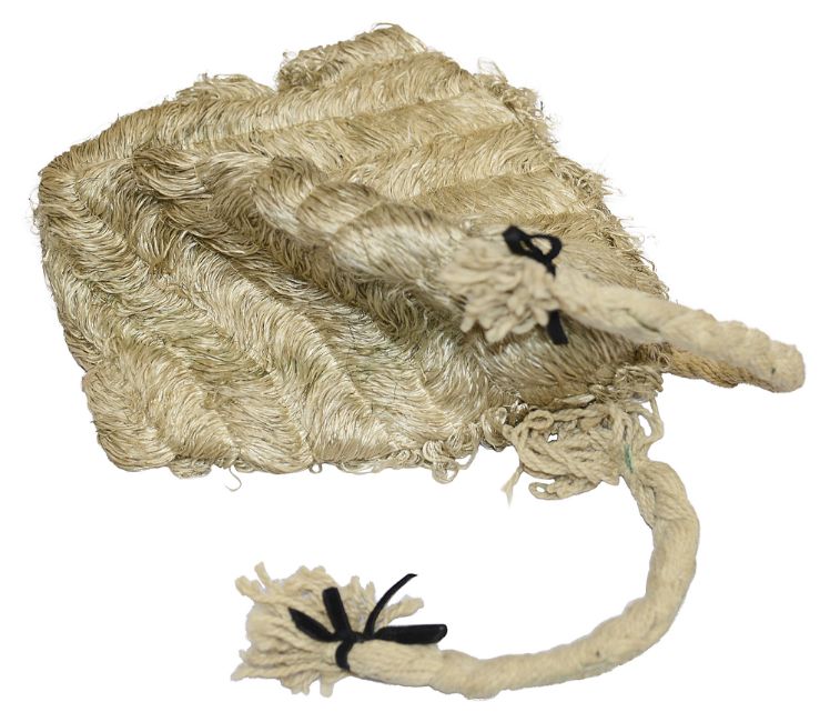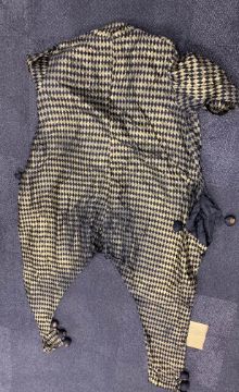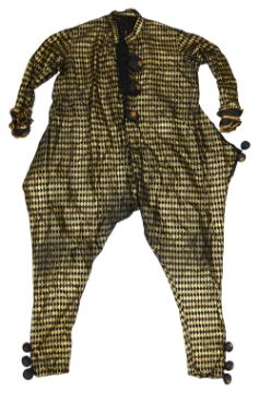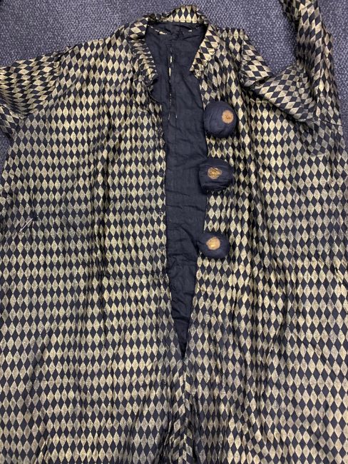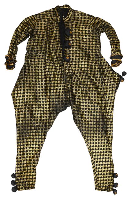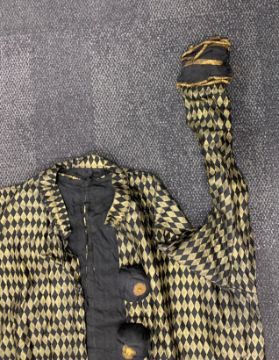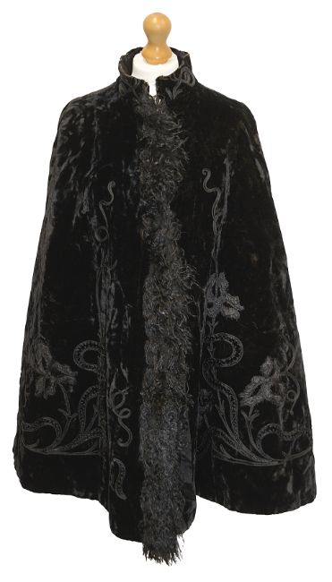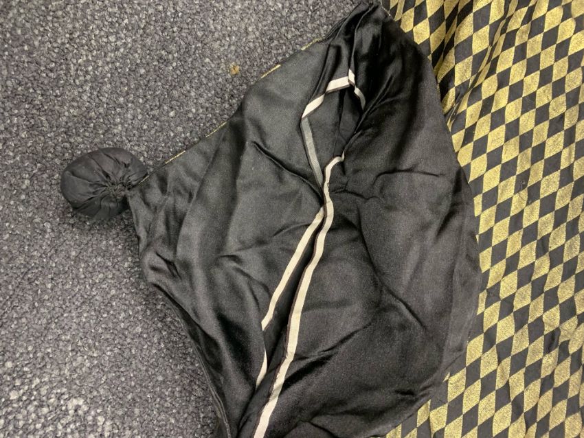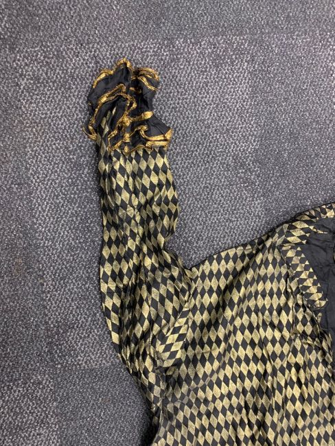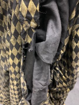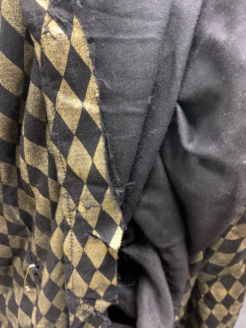 Three pieces of late 19th / early 20th century fancy dress / costume, including; a black velvet cape, with applied brocade and sheepskin edging, silk lining; a large harlequin costume, of black and gold coloured cotton fabric with oversized fabric coloured buttons, gold braid edging, and a theatrical barristers wig (3) Condition: Overall condition good - fair. Wear to all pieces visible, plat detached from wig.Harlequin costume - Wear to gold colour of fabric in places, some fraying so interior edges and tear and cut visible.
