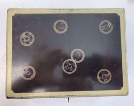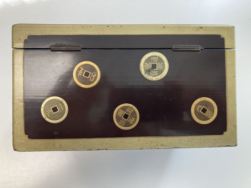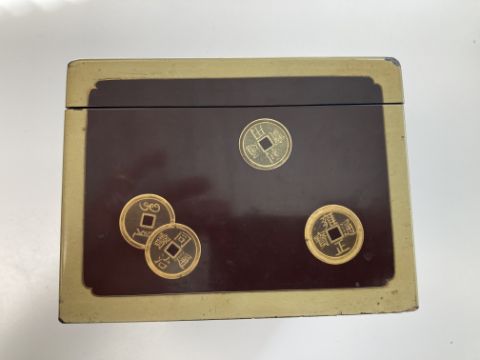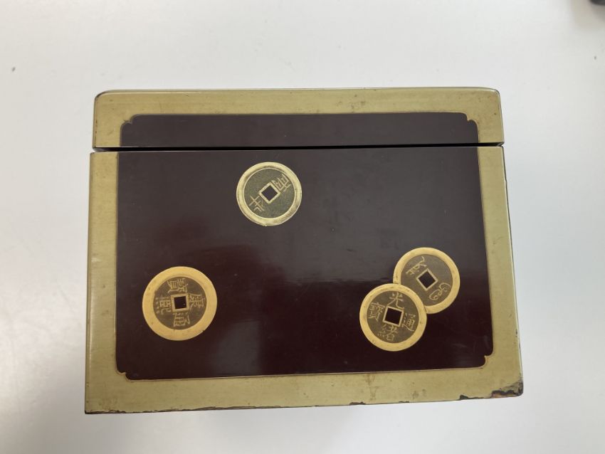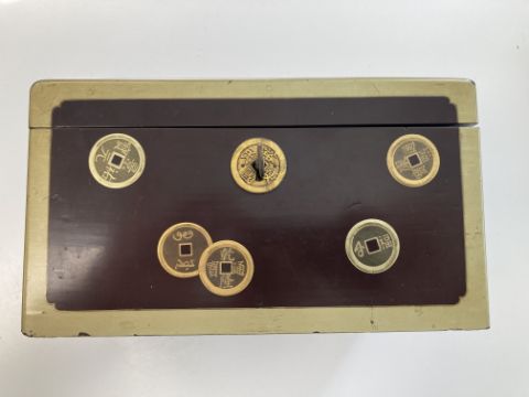 Condition: Key present and in lock in working order. Some rubbing to gilt on boxe edges and coin notably on the top