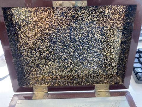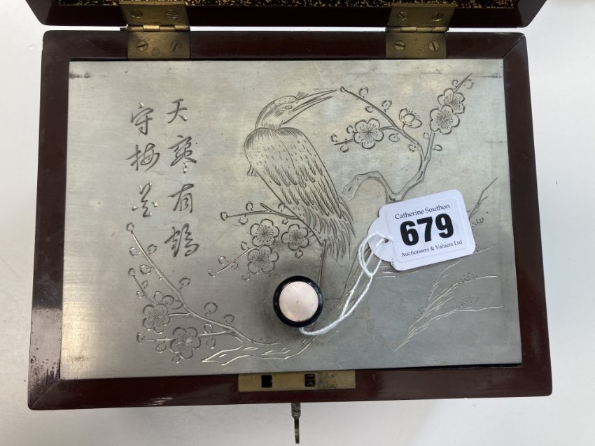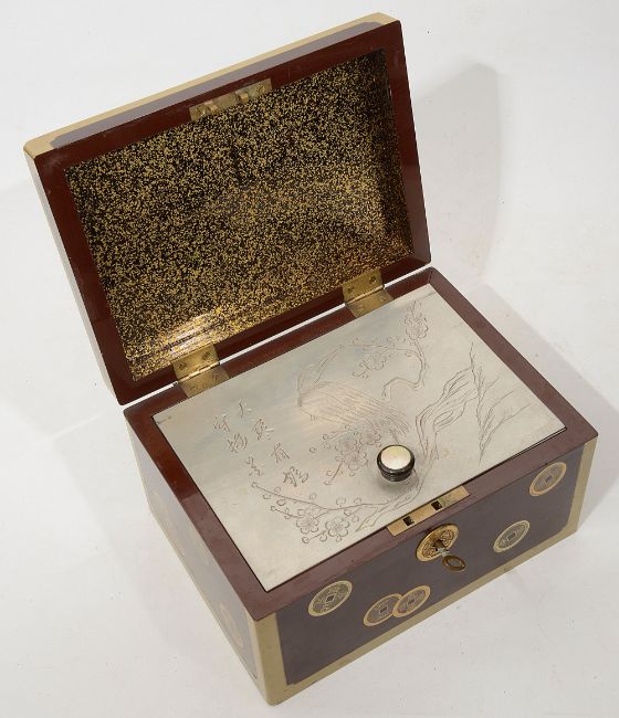 the exterior decorated with gilt trompe l'oeil coins and bindings, black gold flecked interior fitted with a lift out lead liner, the hinged lid engraved with a heron perched on flowering prunus branches and calligraphy
