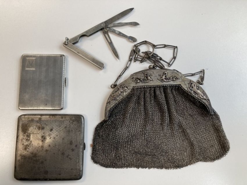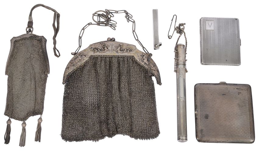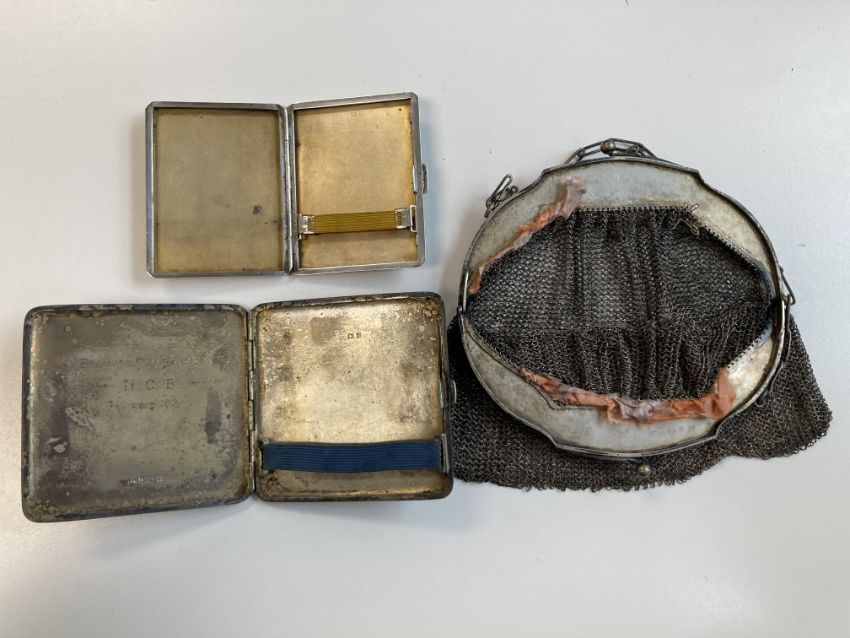 A small collection of silver to include cigarette cases and mesh evening bags