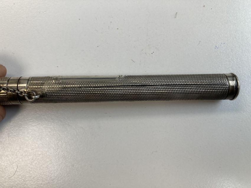 comprising two engine turned cigarette cases, the larger with presentation inscription to interior, two German .800 mesh evening bags one with a mesh strap with tassel drops, the other larger with the frame decorated in relief with classical maidens on chain with fingering, an engine turned silver cased folding pocket manicure set and Sampson Mordan engine turned pen or pencil case with chatelaine chain, (6)