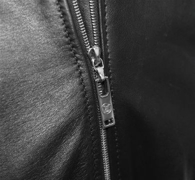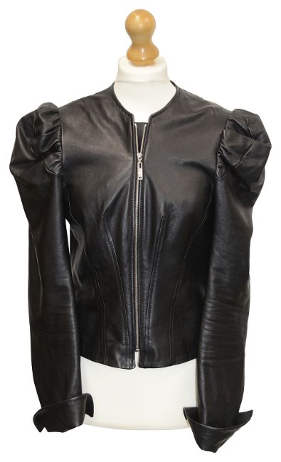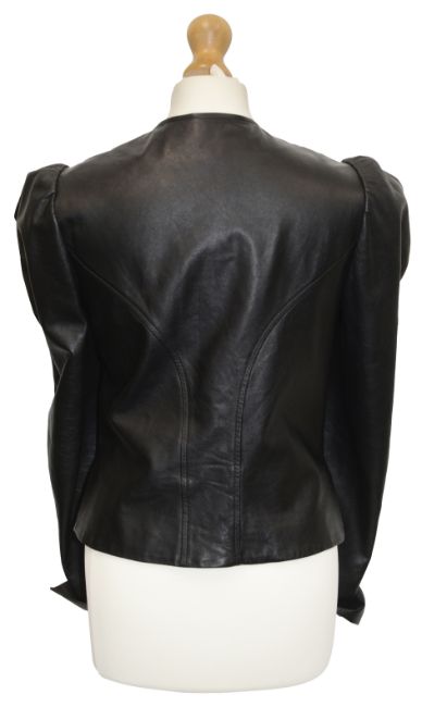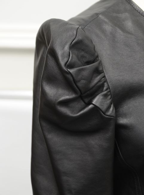black jacket with puff shoulders in a buttery soft nappa leather, fully lined collarless jacket with zip fastening at front