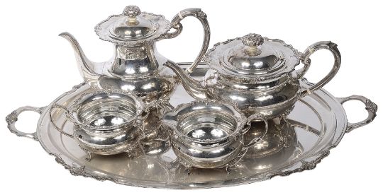 of circular compressed bellied form with scroll handles and moulded foliate borders, on scroll feet, comprising teapot, coffee pot with hinged domed covers and foliate knop finials, twin handled sugar basin, cream jug and twin handled oval tray, accompanied by original sale receipts, (5)