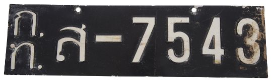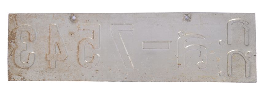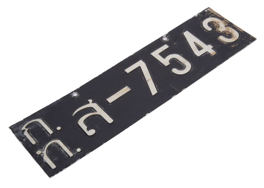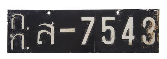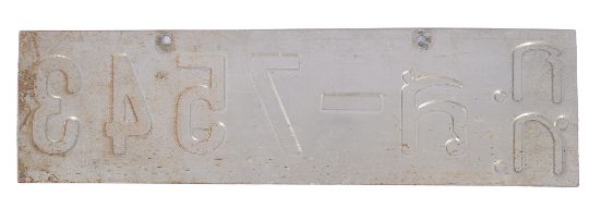 James Bond : The Man With The Golden Gun, 1974 - An original prop number plate used on Scaramanga's AMC Matador Coupe, pressed aluminium, painted black with white embossed '___-7543', with attachment holes to top edge, 39 x 11cmCondition: Overall condition good, some surface wear and in accordance with age and use. The iconic AMC Matador Coupe is driven by Francisco Scaramanga (Sir Christopher Lee) in the film. The vehicle is instantly recognisable as the flying car, which transforms into an aeroplane allowing Scaramanga and Nick Nack to avoid capture. American Motors Corporation provided a number of vehicles for the production as part of a publicity campaign for the company. This prop number plate was gifted post production to the former International Marketing & Distribution Manager for American Motors Corporation, who during his career was based in both the UK and USA. The vehicle was shipped to the production in Thailand from the UK. Post production the vehicle was returned to Swindon, UK where the father of the present owner was presented with plate. Thence by descent.