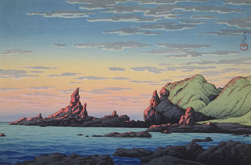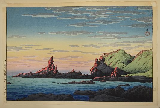 'Ryuga Island, Oga Peninsula', Showa era woodblock from the Souvenirs of Travels, Third Series, signed Hasui and bearing seal, published by Watanabe Shozabura, dated in pencil 1925, mounted