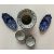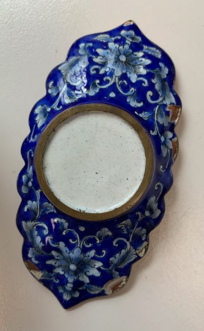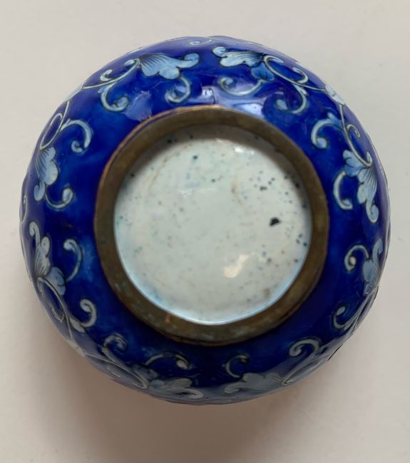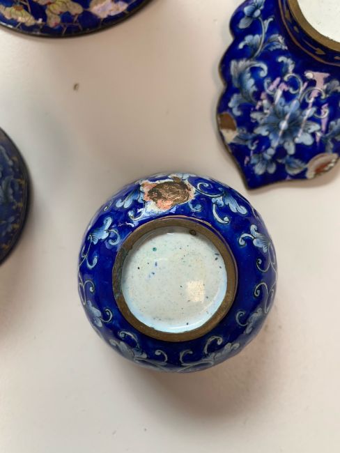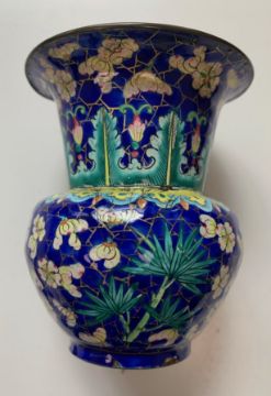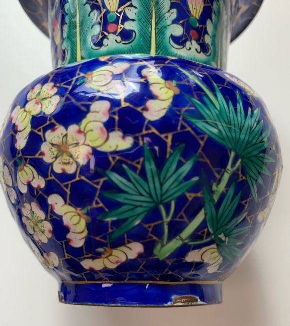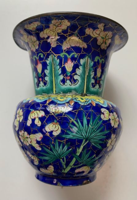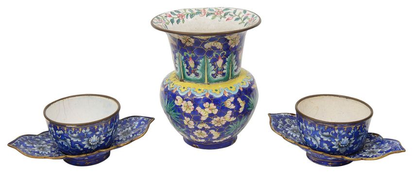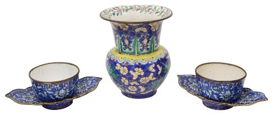19th century, with flared neck, decorated with flower and bamboo over cracked ice pattern against a blue coloured ground, together with a pair of Chinese Canton enamelled metal rice wine cups and saucers, decorated with repeating floral and scrolling leaf motif against a cobalt blue ground, heightened with gilt, the saucers of ellipse form with shaped edge, (5)