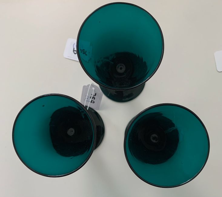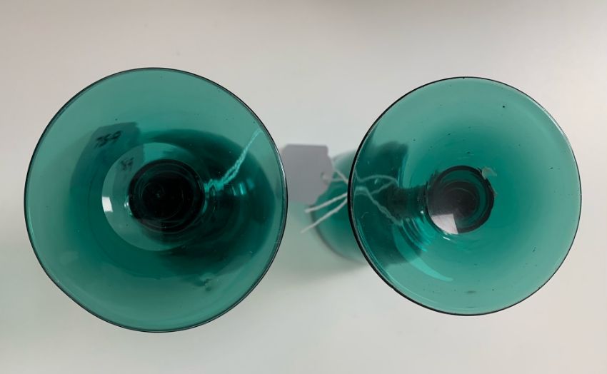 three of similar design with trumpet shaped bowl, baluster stem with knop, ground pontil, three with trumpet shaped bowl, bladed knop stem, pontil marks to base, two with round bowl (8)