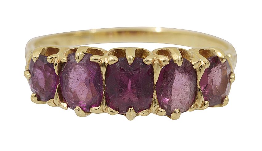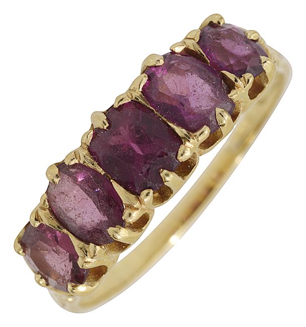 set with a tapering line of graduated cushion-shaped garnets to the yellow gold setting (marks rubbed)