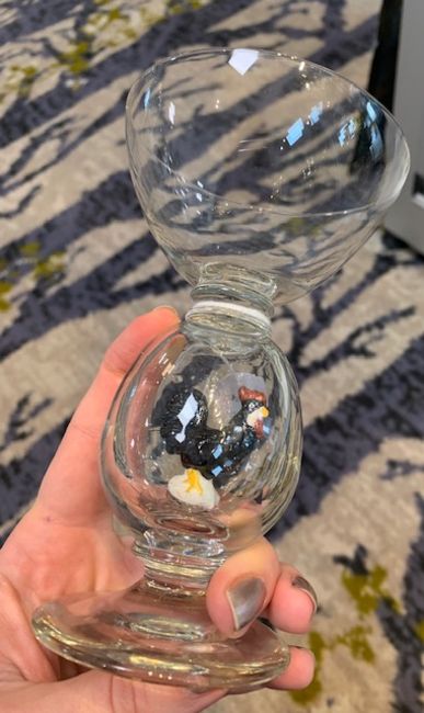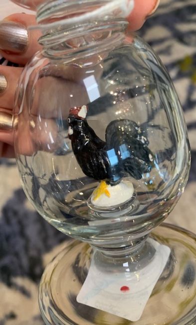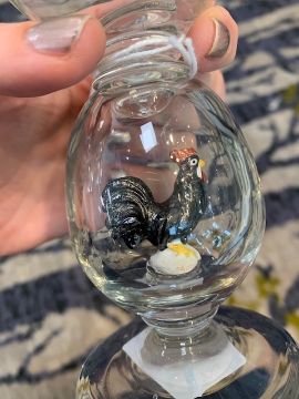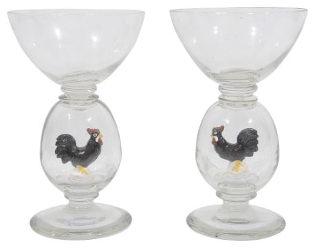 each with wide circular tapering bowls on large hollow blown knop stems containing a painted figure of a cockerel, on a spreading circular foot, (2)