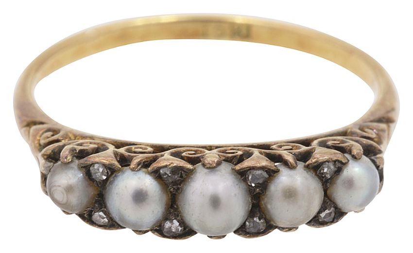 the five graduated pearls with rose-cut points between to the pierced scrolling gallery and closed back yellow gold setting, the shank stamped '18ct'
