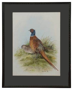 'Common Pheasants', watercolour on paper, signed to lower right, dated to label verso 'Jan 1975', framed and mounted,