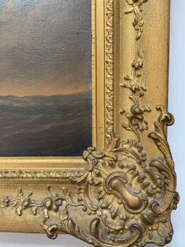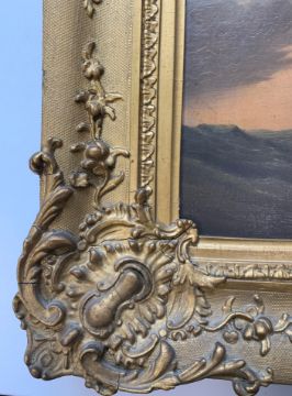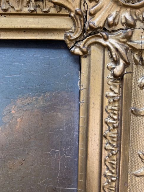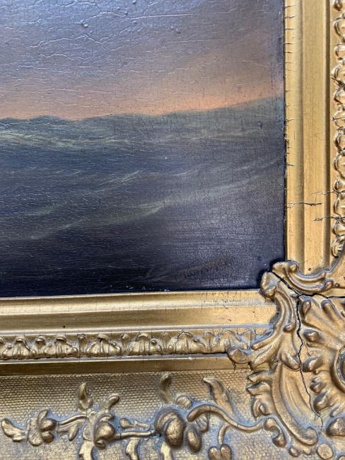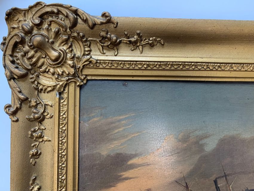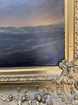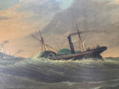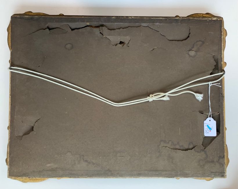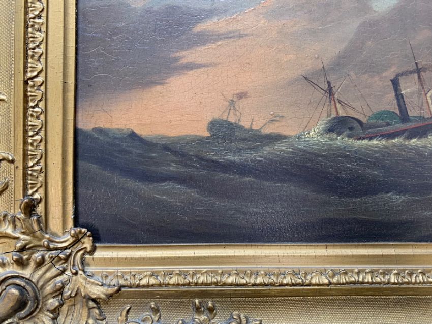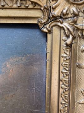 Condition: Picture would benefit from cleaning, surface dirt throughout. Craqueleur across entire work, small area of damage visible to top left edge. Some lifting to painting, minor damage visible to vessel losses to right edge. Cracks to frame, slightly loose within frame, paper verso frame torn.