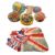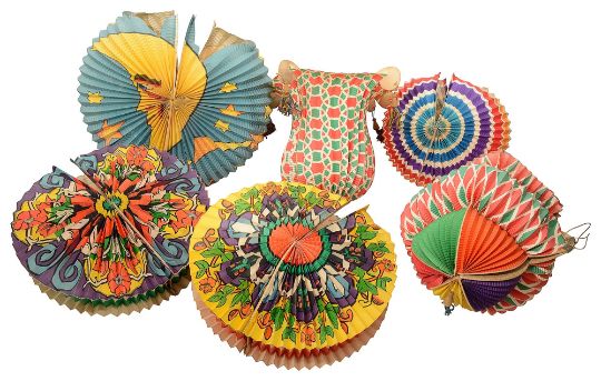 Six 1930s hanging brightly printed paper candle party lanterns, etc.