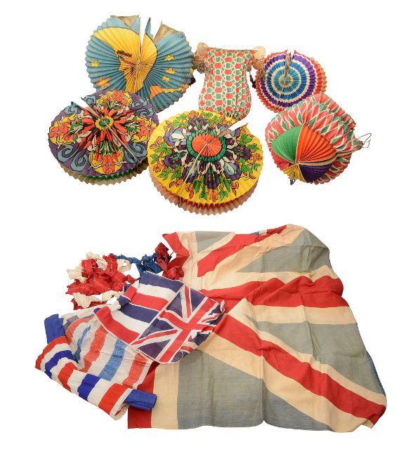 together with a linen union jack flag and pennants, crepe ribbons, etc., (qty)