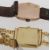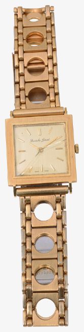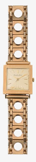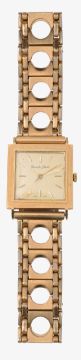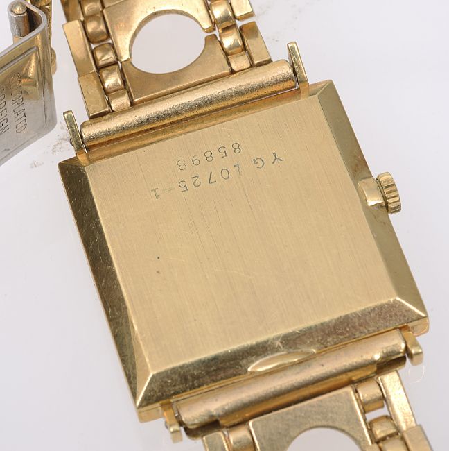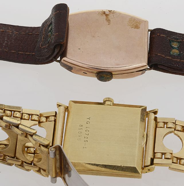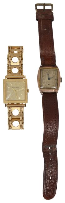 first square brushed gold coloured dial with raised baton hours, 17 jewels movement, manual wind, associated gold plated bracelet with deployment clasp, second tonneau shaped c.1940 on a leather bracelet. (2)