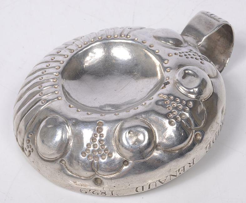 circular form with reeded loop handled, part fluted part punch bead and grape decorated, engraved to rim 'Claude Renaud 1829'