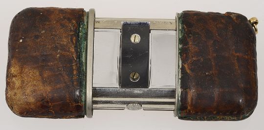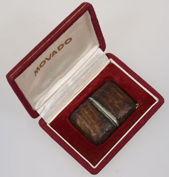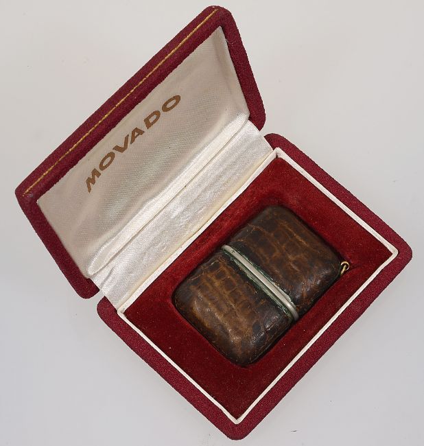 A travelling watch by Movado, the shaped rectangular brown leather case opening to reveal the dial with Arabic numerals signed MOVADO/ Chronometre/Ermeto, maker's sprung maroon fitted case stamped Movado externally and internally