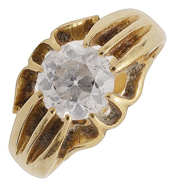 the old brilliant-cut diamond estimated to weigh 1.30 cts approx. to the elaborate claw setting and plain shank stamped '18'