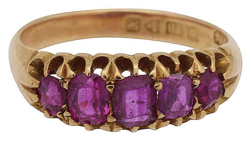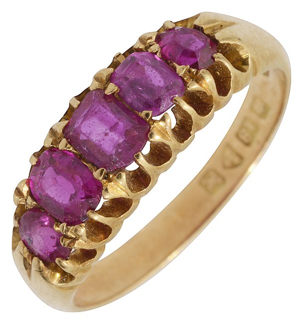 An Edwardian graduated five stone pink sapphire ring, set with three cushion-shaped pink sapphires to the centre with a circular-cut pink sapphire, 18ct yellow gold setting, Chester 1910