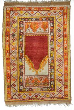in red, orange wool, grey coloured ground, with repeating geometric floral border, centre with stepped hooked Mihrab, flat weave ends,