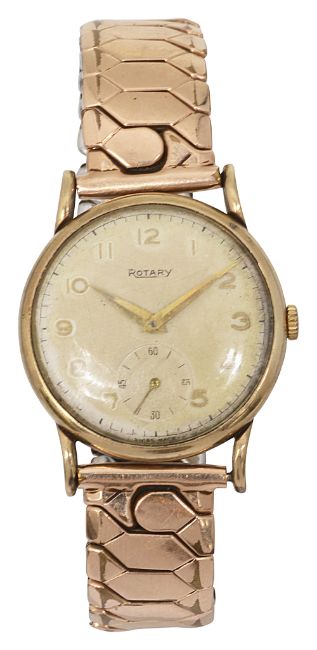 the champagne dial with Arabic numerals, subsidiary seconds, 9ct gold case and expandable stainless steel bracelet