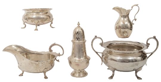 first, Sheffield, 1913 by James Deakin & Sons, of plain twin handled circular bellied form with wave edge rim on four hoof feet, together with a smaller similar sugar basin without handles. London, 1926 by Charles Boyton & Sons, the sauce boat Birmingham, 1934 by Barker Brothers Silver Ltd, of typical form with wavy edged rim and flying leaf capped scroll handle, etc., (5)