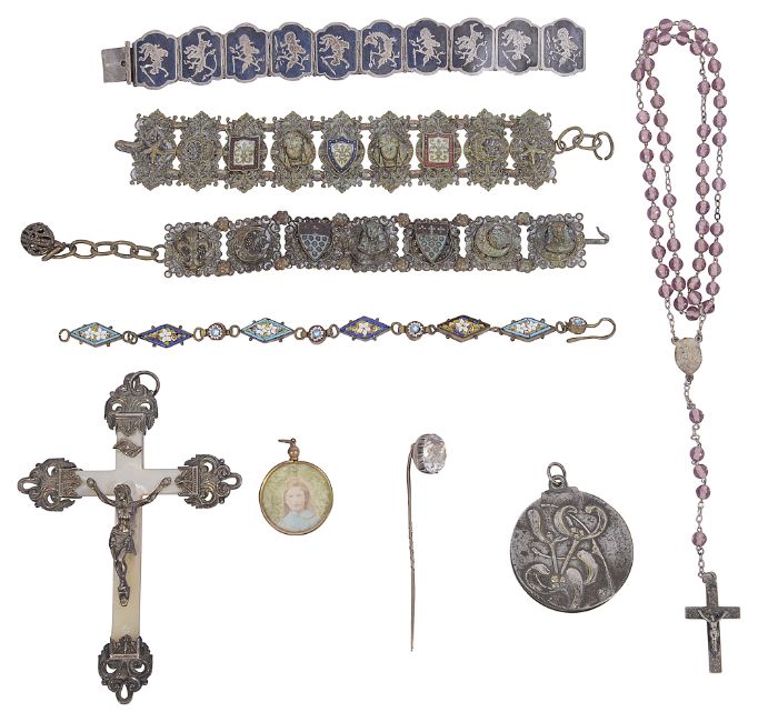 to include a gold, enamel and diamond ring bearing the initial V., a baroque pearl set ring and a red stone set ring, a clear paste stone set stick pin a Thai silver and niello panel bracelet, a continental silver and mother of pearl crucifix pendant, a pair of tortoiseshell lorgnettes, two monocles, an Ingersoll Mickey Mouse wristwatch, etc. (qty)