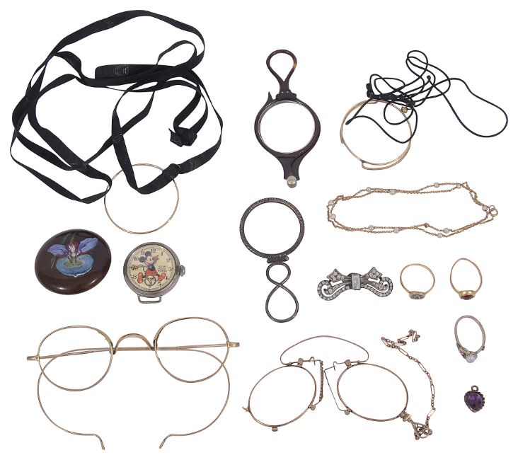 Condition: Loss to enamel on the diamond set ring. baroque pearl ring with loss to leaf mount, tortoiseshell lorgnettes with absent lens, one monocle also without lens. Ingersoll wristwatch lacking one lug, does not wind