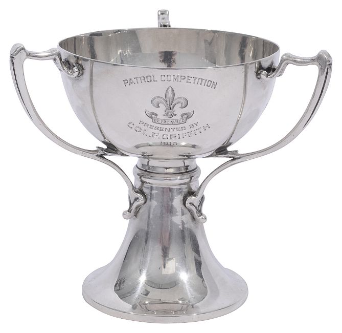 of plain design on a spreading stem base with whiplash handles, presentation scouting inscription dated 1915