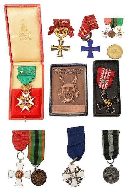 comprising a three medal group formed of a Swedish gold and white enamel Order Of Vasa, I Class Grand Cross, stamped 18K in a fitted case, accompanied by an silver and enamel Order of the Lion of Finland enamel cross and Bravery medal dated 1941, accompanied by a set of miniatures, together with an Order of the White Rose of Finland, and two Orders of the Cross of Liberty, 1918 3rd and 4th class, a 1918 commemorative medal of the War of Liberation and a 1939-45 headquarters cross,in original box, on ribbons, etc., (qty)