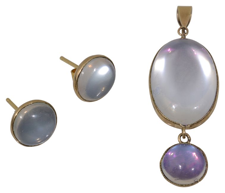 the pendant comprising an oval cabochon collet suspending a circular cabochon collet, together with a pair of circular cabochon collet ear studs (2)