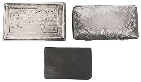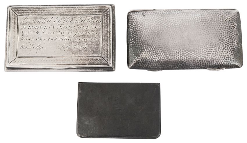 first Birmingham, 1839 by Edward Smith, of rectangular form with bow sides engraved "presented by the Brothers of Lodge No671 G.U.O.F. To P.A.F. John Rigby for his persevering and active services to his Lodge Sepr 1846, gilt interior, second Chester, 1909 by Sampson Mordan & Co, rectangular cushion form, initialled, gilt interior dated 25.12.11, third, engraved Birgit, (3)