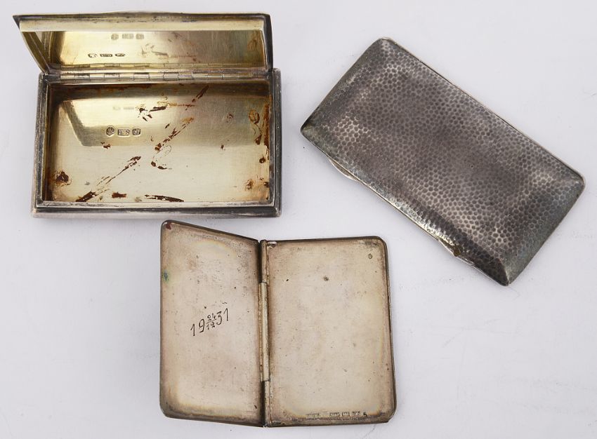 An early Victorian Masonic presentation engine turned snuff box, an Edwardian spot hammered card case and a Swedish matchbook case