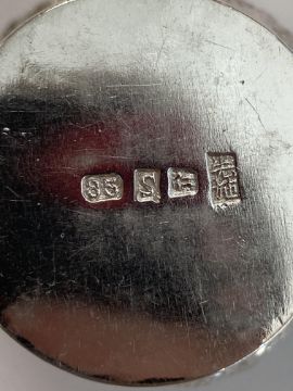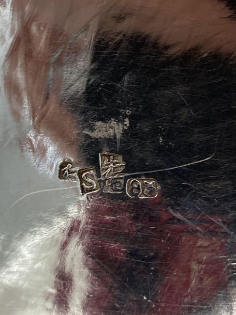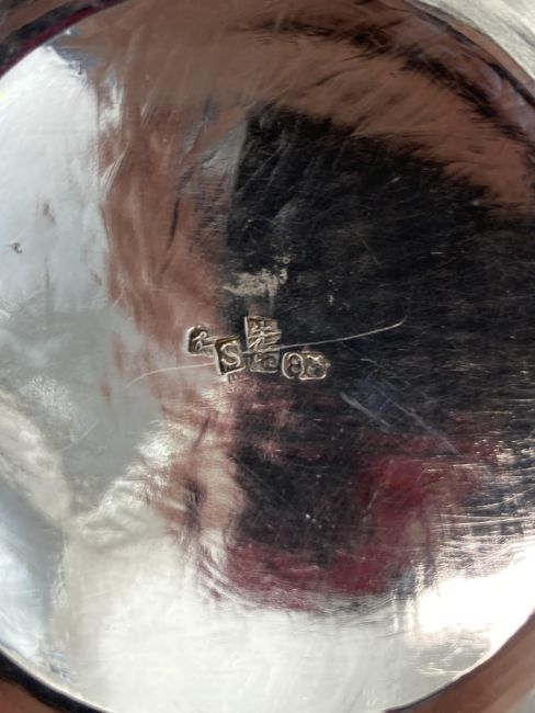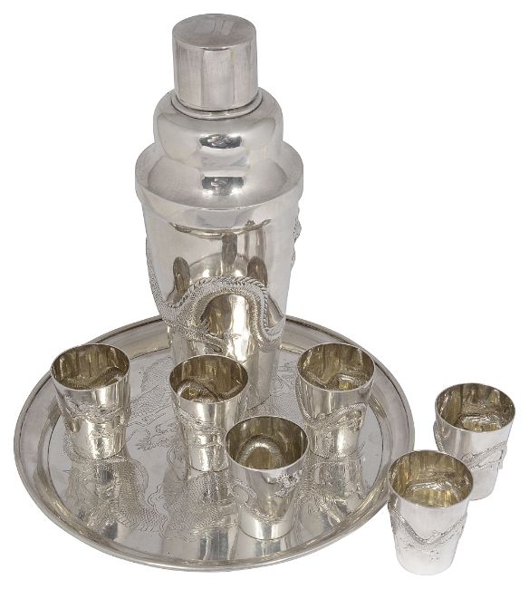 comprising a cocktail shaker and six tots, stamped with a monogram S punch 85, of plain tapering form repousse embossed with a chasing dragon and a plain circular tray with raised border chased with a conforming dragon marked S.Co 85 (8)