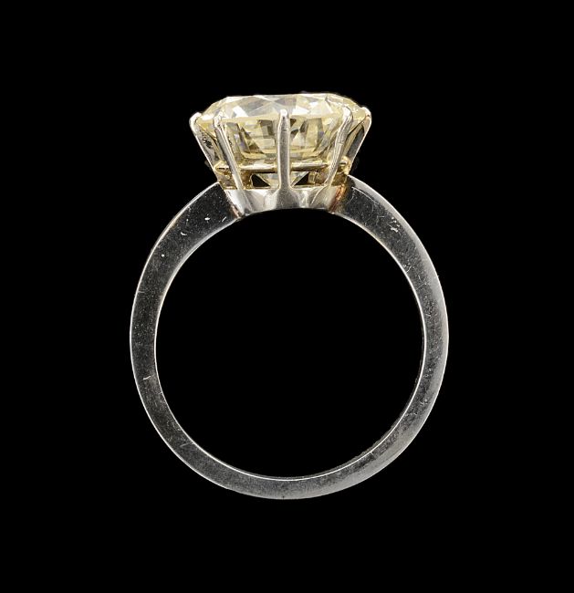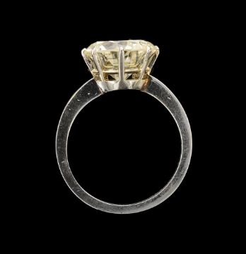the very light yellow brilliant-cut diamond weighing 4.92 cts, coronet-set above the ridged shank stamped '750'