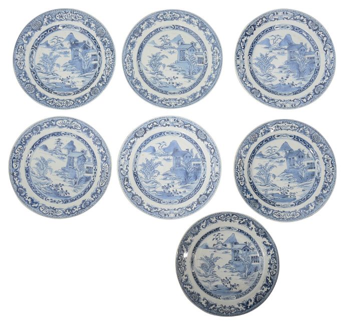 Seven 18th century Chinese export blue and white porcelain plates