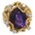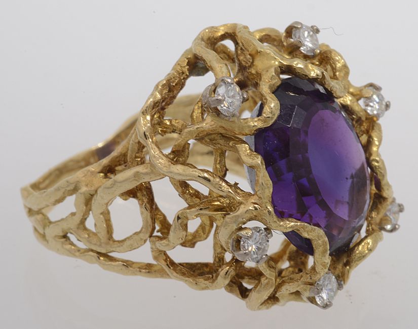 A stylish 1960s/1970s amethyst and diamond-set ring, the central oval amethyst within an elaborate scrolling textured wire work surround and shoulders set at intervals with six brilliant-cut diamonds