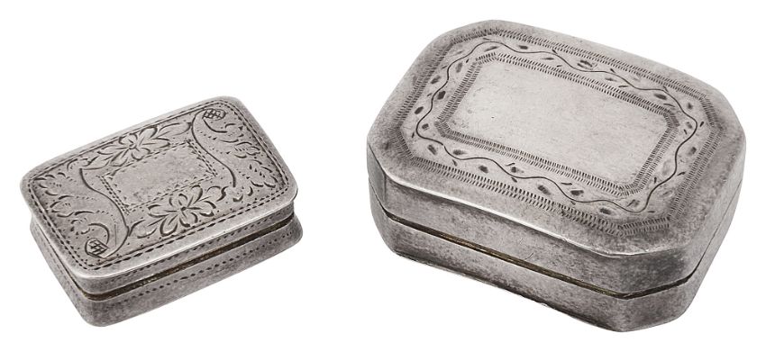 first Birmingham, 1813 by Samuel Pemberton, of curved rectangular form with canted corners, the hinged lid with bright cut border, interior gilt engraved 'Anne' with hinged pierce grille, second Birmingham, 1832 by Nathaniel Mills, the rectangular body with concave sides decorated with bright-cut engraving, slightly domed lid within engraved a central tablet within foliate borders, the gilt interior with hinged pierced grille, (2)