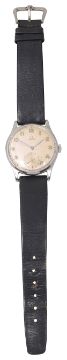 silvered dial with raised Arabic numerals and subsidiary seconds dial, manual wind, 15 jewels movement, cal 265 numbered 11726874, the snap on case case back signed Dennison and numbered 13322 2920, leather bracelet with Omega clasp