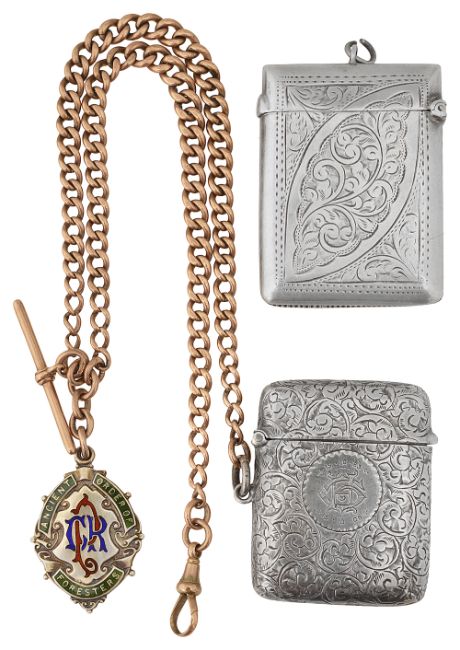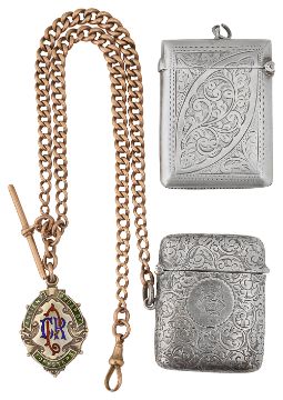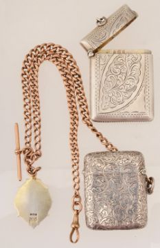 marked on the clasp and links 9ct with silver and enamel fob and two silver vestas both chased with leaves and scrolls