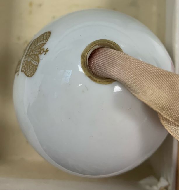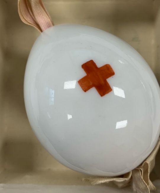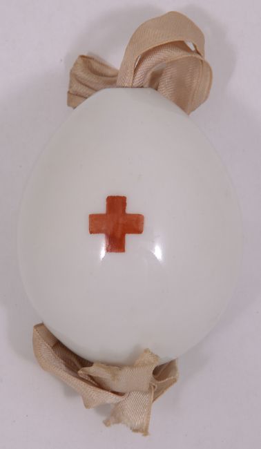 Imperial Porcelain Factory, St Petersburg, the front bearing the cypher of Empress Alexandra Feodorovna (Tsarina of Nicholas II) beneath a crown, painted red cross to reverse, with internal ribbon,