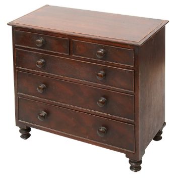 traders sample or apprentice piece, the moulded edge over two short over three long graduated drawers, turned knob handles, on turned feet,