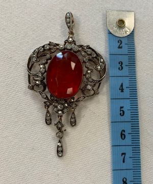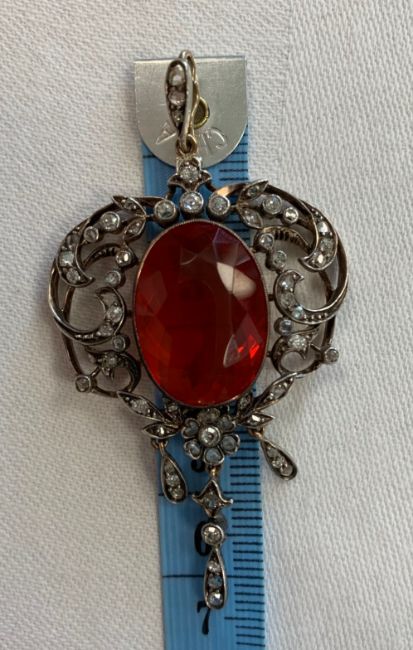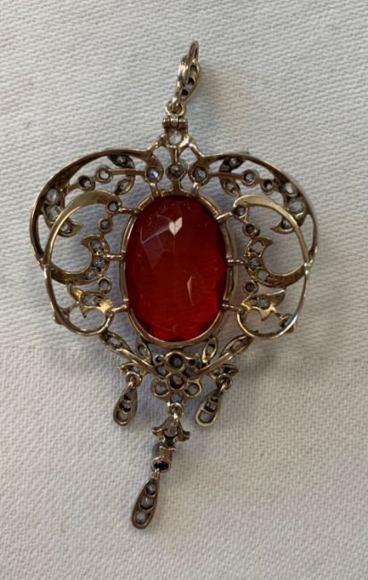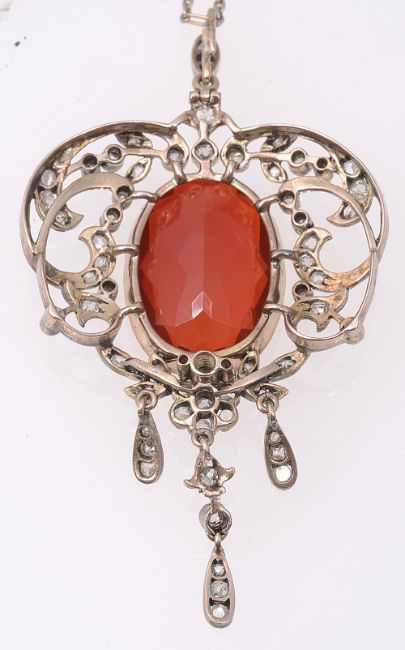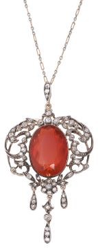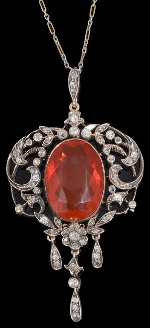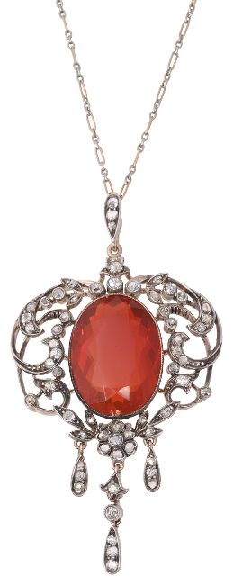 A late 19th/early 20th century fire opal and diamond-set pendant and chainthe oval fire opal collet-set within an open-work scrolling and floral cluster surround, fringe and surmount set with old-cut diamonds, mounted in silver and yellow gold; together with an Edwardian fetter and three platinum and yellow gold chain necklacependant: fire opal 21.4mm x 15.4 mm, pendant 6.4mm x 3.5 cm, weight 9.3 g, Chain length 45 cm, 2.9 g Condition:A very stylish piece.Overall condition good, commensurate with age.Fire opal:  strong,  even colour similar to front cover illustration (lifesize) rather than internal  illustration.  Minute chip at base by collet setting.Diamonds:  Bright  setting stones, various cuts, some possibly replacements.   slight wear to a few of the collets.   Silver and yellow setting.Chain:  good condition.