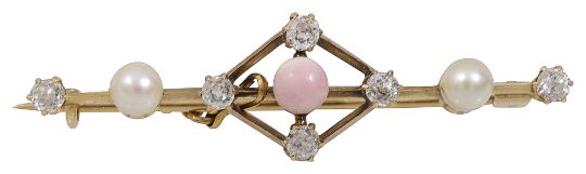 A late Victorian conch pearl and diamond open-work knife bar brooch, the central conch pearl with an old brilliant-cut diamond to each of the cardinal points, a pearl (untested) and an old brilliant-cut diamond set to each side, safety chain