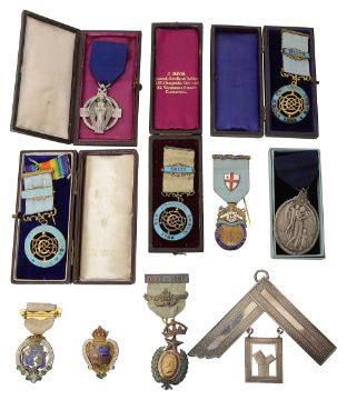 first engraved verso "Presented by the Old Concord Lodge No172 To W. Bro. John Burch Jany 4th 1916 together with various related silver and enamel medals on ribbons, some cased to include three Old Concord lodge medals, a Great war medal,a 1919 Peace medal etc., (qty)
